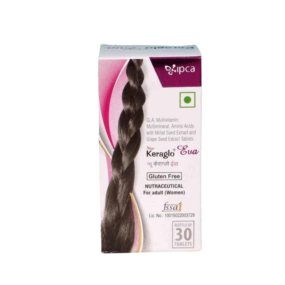 IPCA Keraglo Eva Tablet is a specialized hair health supplement designed for women experiencing hair loss and thinning. Formulated with a blend of powerful ingredients like Gamma-Linolenic Acid (GLA) and N-acetyl-l-Cysteine, this tablet strengthens hair follicles, promotes hair growth, and improves hair texture. By increasing blood flow to the scalp and reducing inflammation, Keraglo Eva Tablet supports fuller, healthier hair, making it an effective solution for various hair concerns.