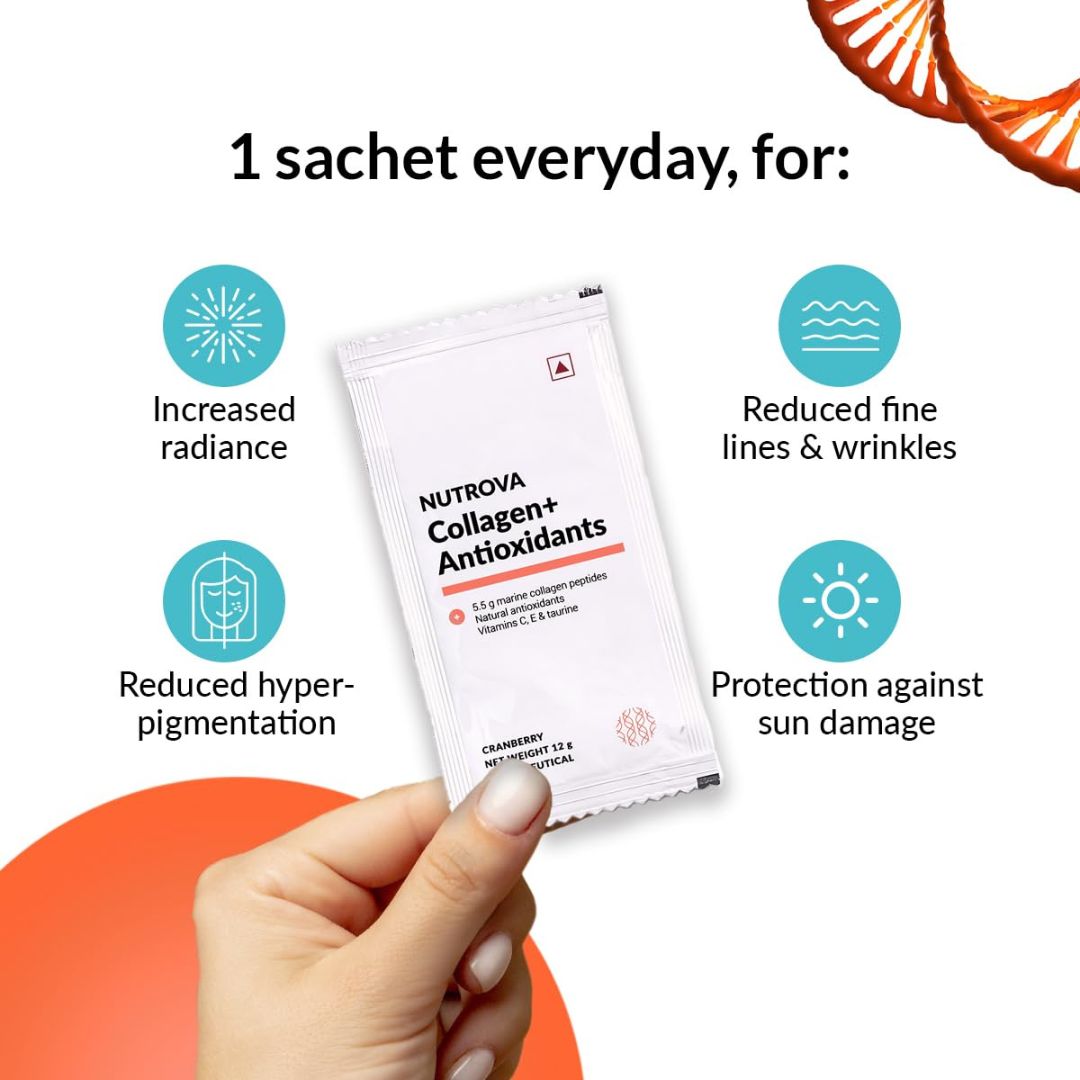Nutrova Collagen+ Antioxidants is a powerhouse blend designed to renew and protect your skin. Formulated to enhance collagen structure, it safeguards against daily damage while boosting hydration, firmness, and elasticity. Say goodbye to dullness, wrinkles, pigmentation, and roughness as this potent formula works to rejuvenate and revitalize your skin for a radiant, youthful complexion. The power of Vitamins C and E, and Taurine helps nourish skin cells that also aid in collagen production.